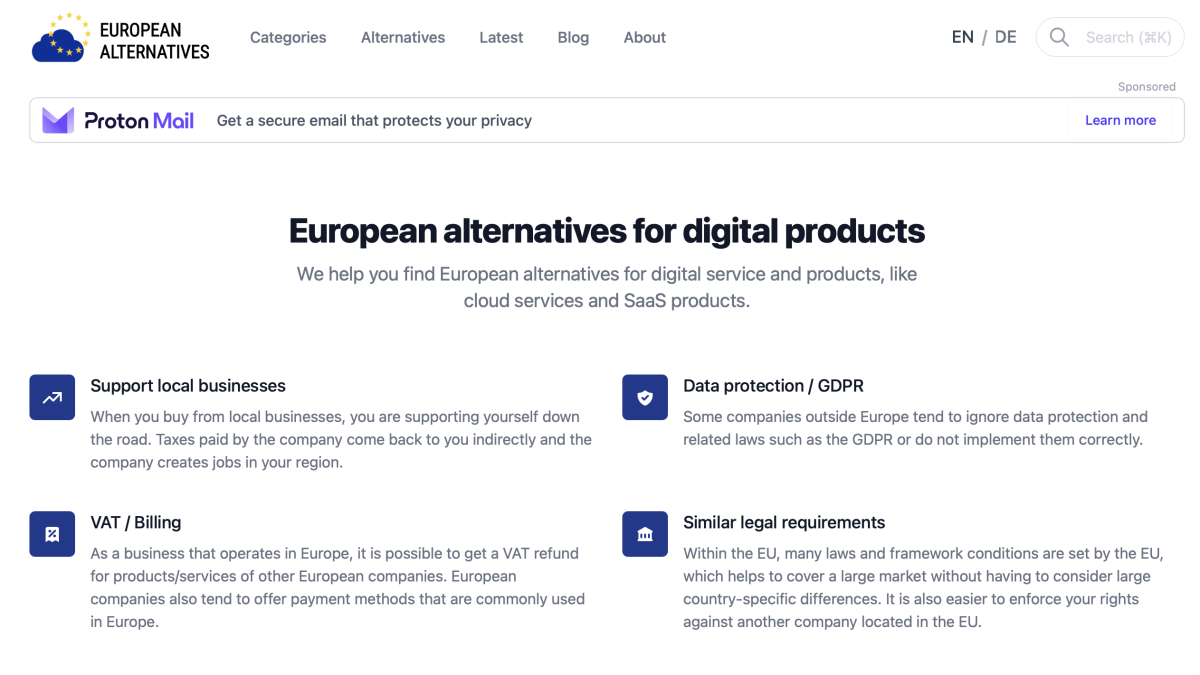 Eurooppalaisia vaihtoehtoja digitaalisille palveluille on olemassa! Mainio sivusto lukuisista eurooppalaisista vaihtoehdoista löytyy tästä osoitteesta: